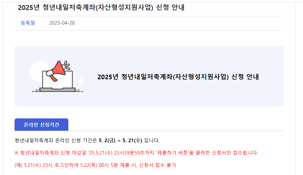 청년내일저축계좌 온라인 신청 기간은 5월 2일(금)~5월 21일(수)입니다.